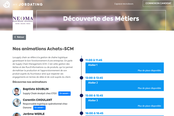 L’administrateur du jobdating pilote l’ensemble des actions du jobdating : de la création des animations en passant par personnalisation de la page de l’évènement et le suivi des statistiques en temps réel.